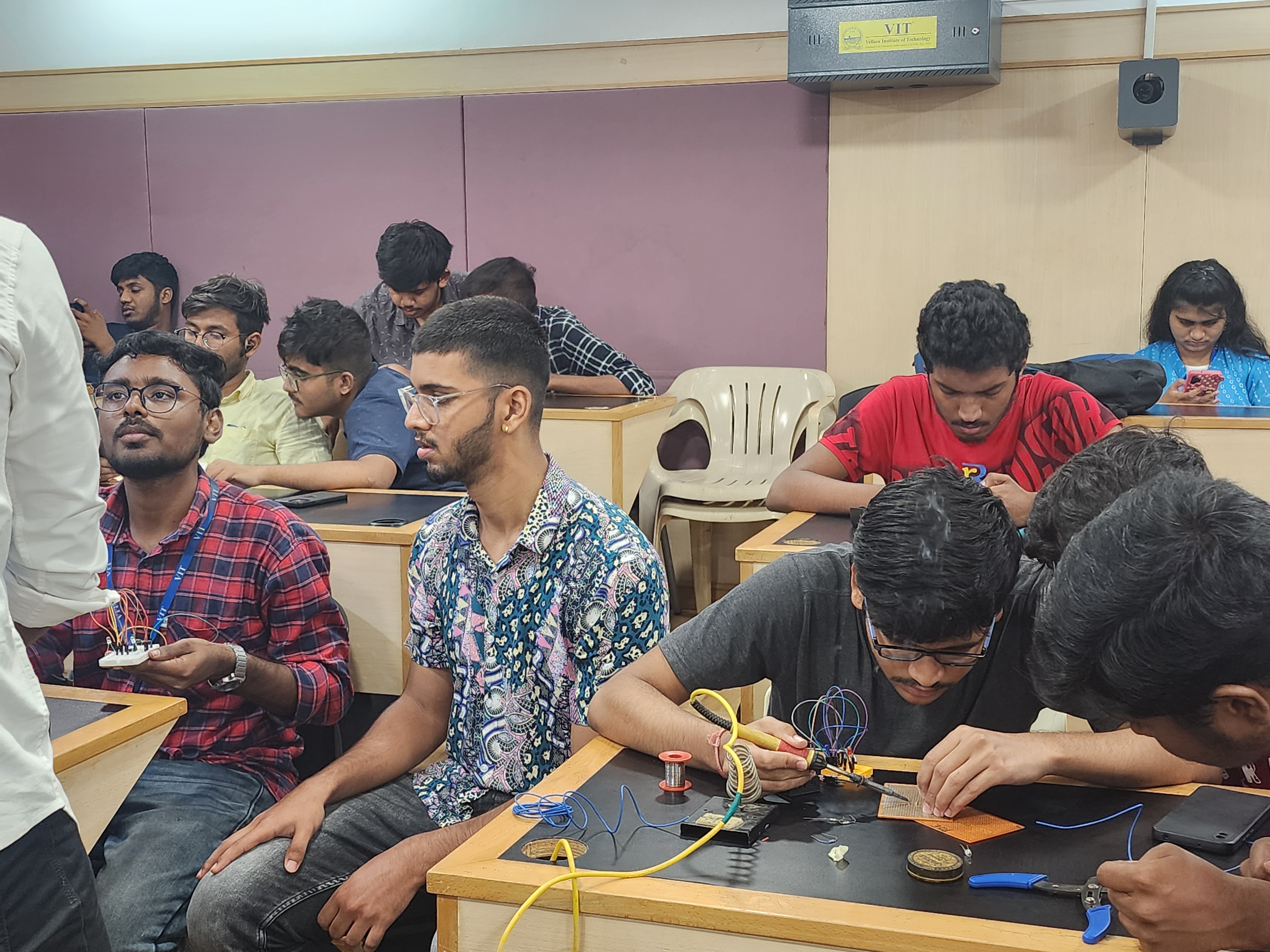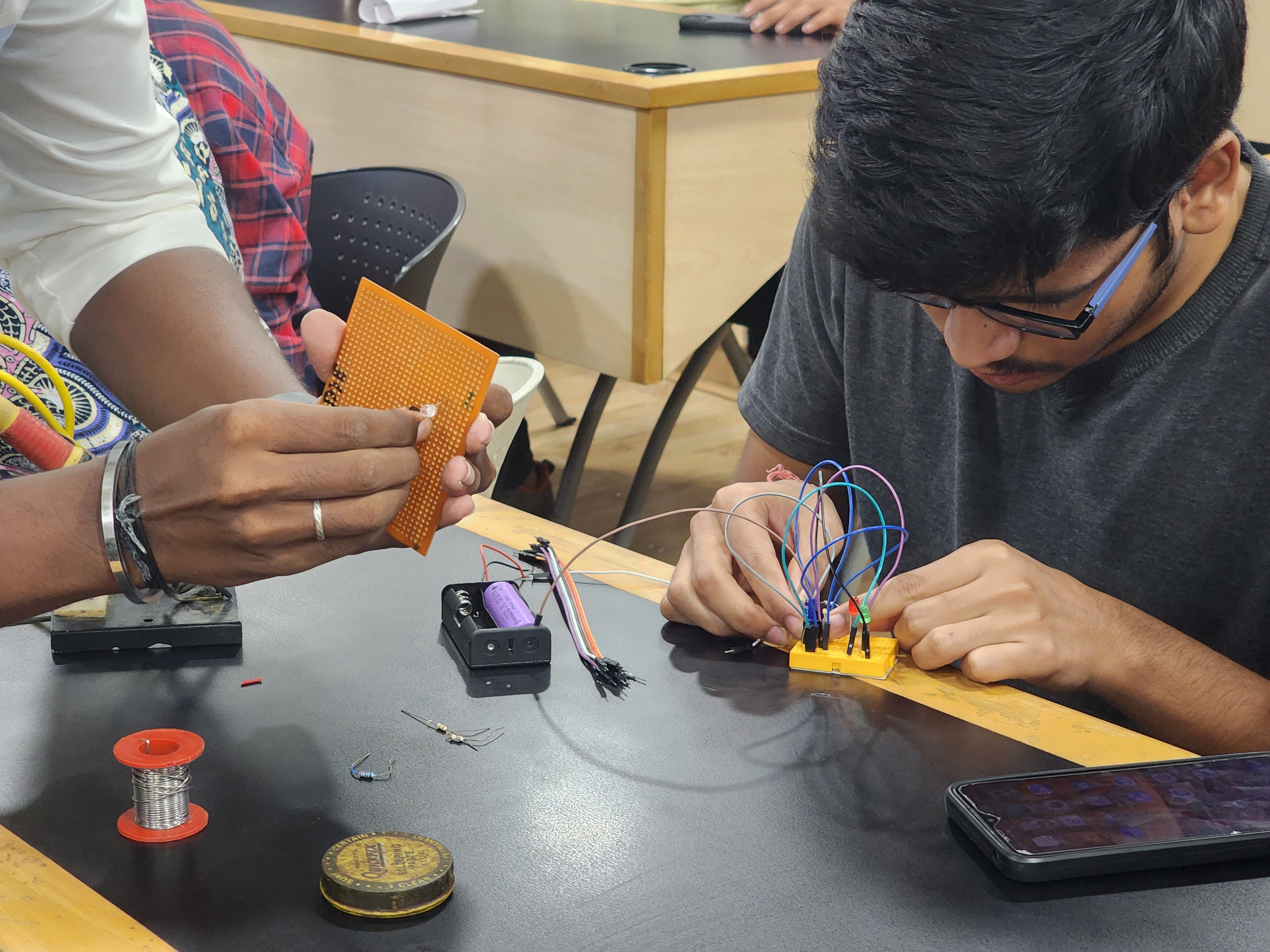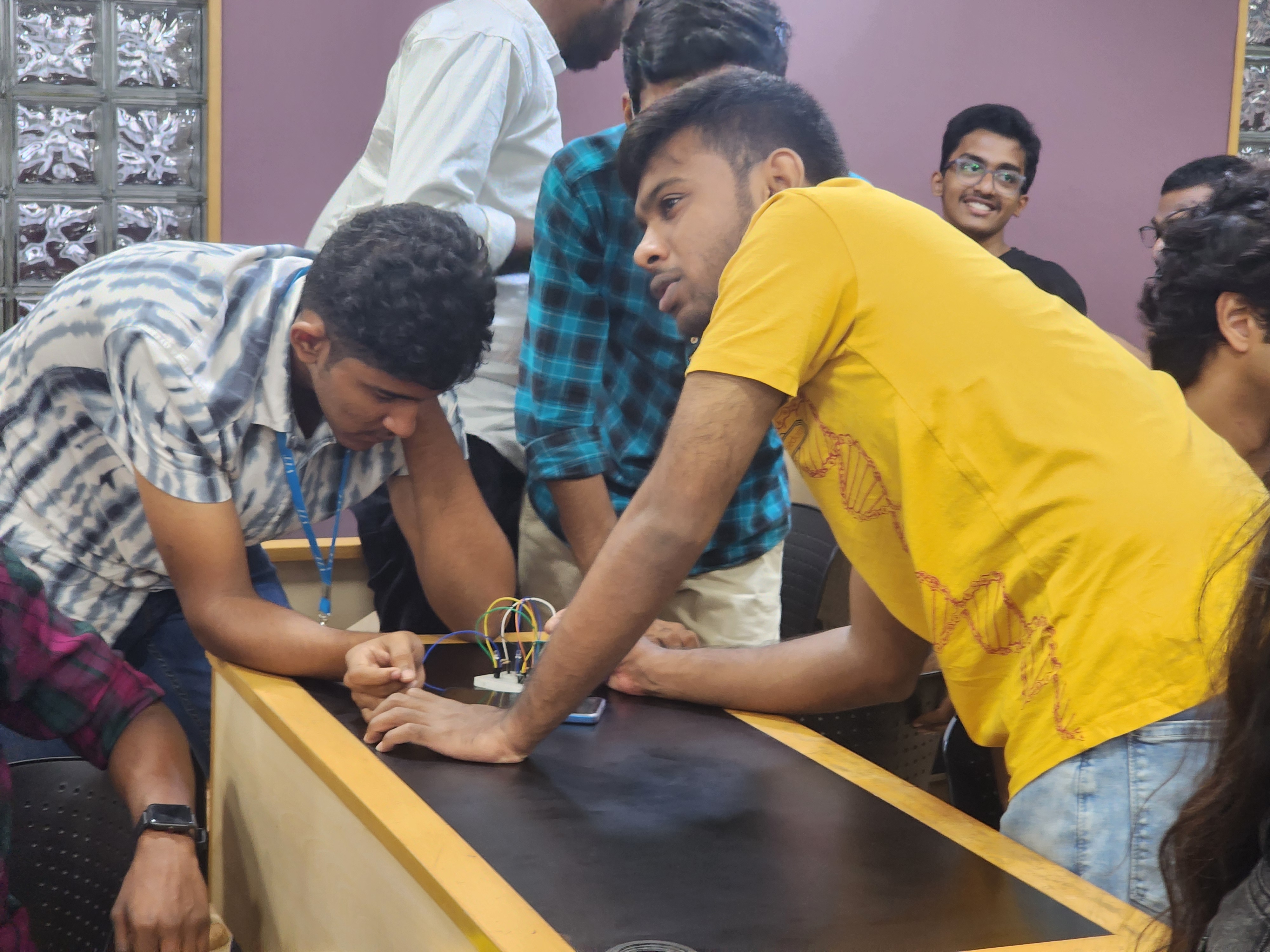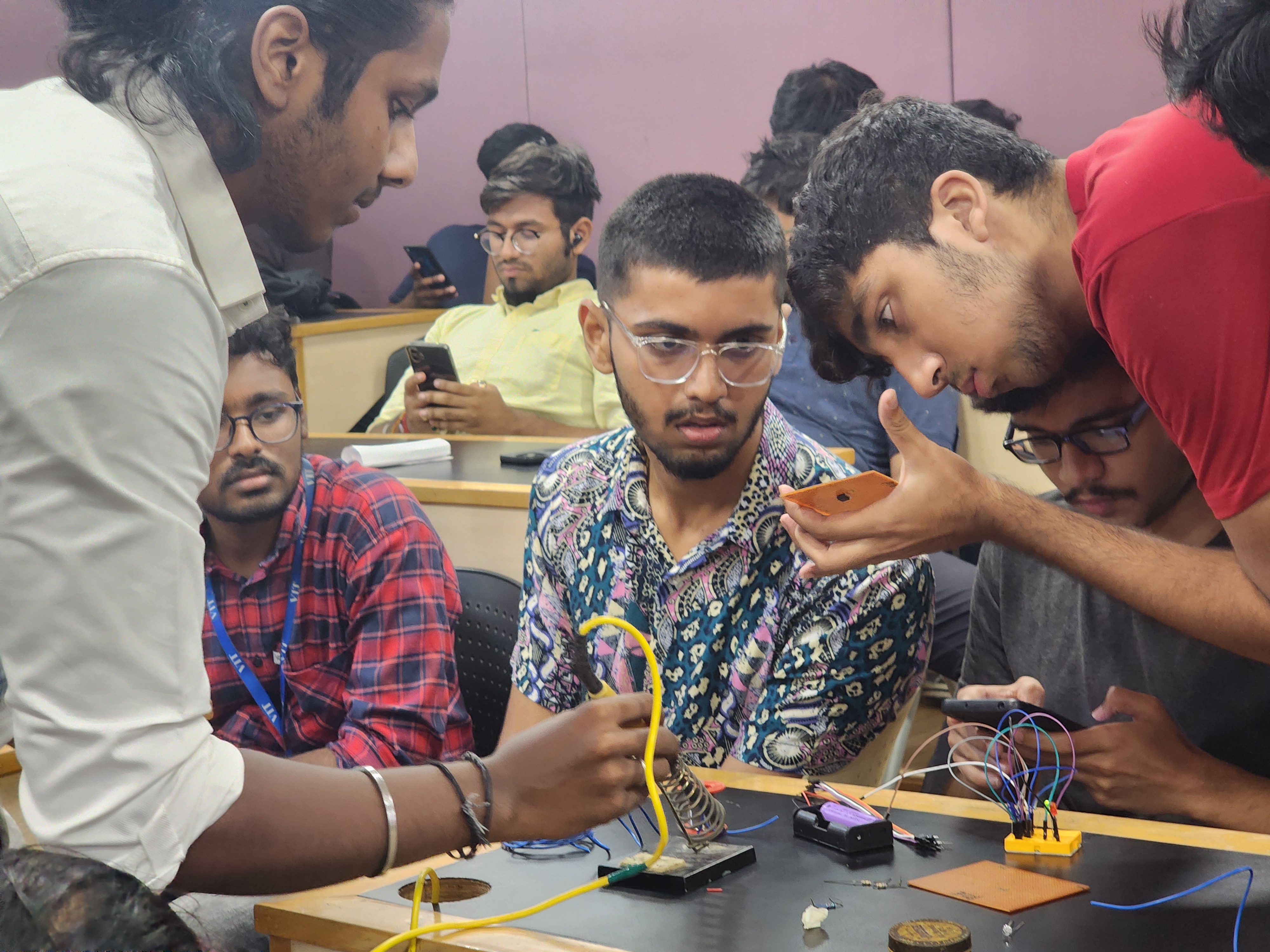 Organized PCBForge, a practical hands-on event where participants built circuits on printed circuit boards (PCBs). Taught essential skills such as soldering, desoldering, and using components like the 555 timer IC. The event emphasized real-world circuit assembly and troubleshooting experience. It successfully fostered technical confidence and engagement through guided experimentation.